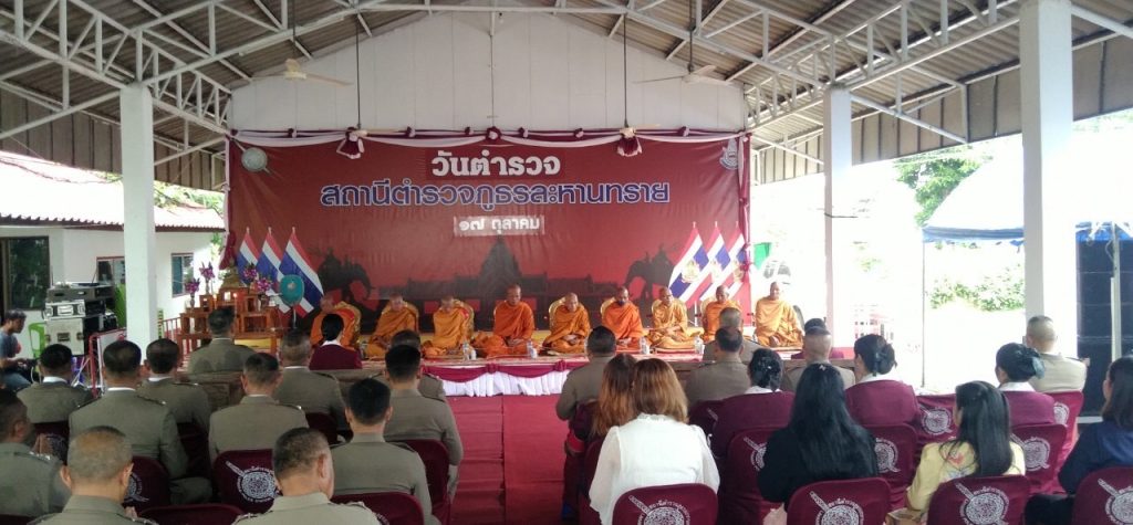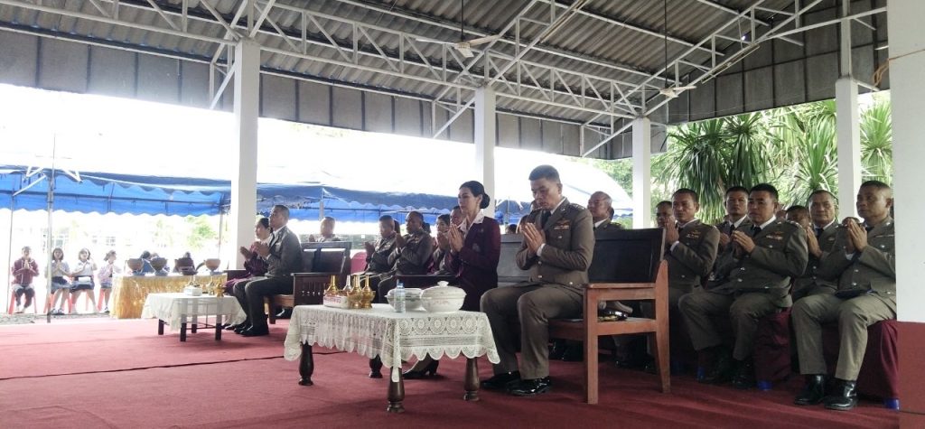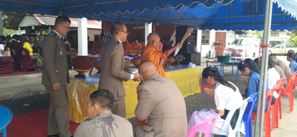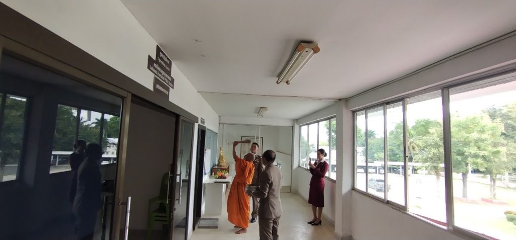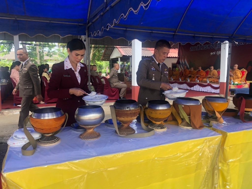 โดยร่วมกันตักบาตรพระสงฆ์ถวายภัตตาหาร(ปิ่นโต) พร้อมกับจตุปัจจัยเครื่องไทยธรรม แด่พระสงฆ์ จำนวน 9 รูป ร่วมกับแขกผู้มีเกียรติ และเพื่อความเป็นศิริมงคลแก่หน่วยงาน ได้นิมนต์พระสงฆ์ประพรมน้ำมนต์แก่ผู้มาร่วมพิธีและอาคารที่ทำการ ตามห้องทำงานต่างๆ